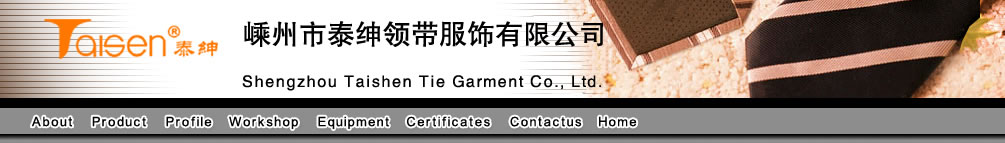 Shengzhou Taishen Tie Garment Co., Ltd. is situated in No.6, Fourth Road Necktie Industrial Park, Shengzhou, Zhejiang,China. It covers an open area of about 10,000 square meters, We are in conformity with ISO9001-2000 standard .mainly produces ornaments such as neckties, cravats, scarves, shoulder marks, etc. and garments. The“TAISHEN”brand neckties enjoy high reputation among customers at home and abroad. They are sold well in more than 80 large or medium-sized marketplaces in China and exported to foreign countries. The company has established business relationship with many countries such as Japan, America, England, Australia, Canada, Korea and United Arab Emirates.Since the company founded, the products passed more than ten times of inspection of the Textile & Garment Quality Control Center of the Internal Trade Ministry and was approved that all theindexes accord with the stipulated standard.