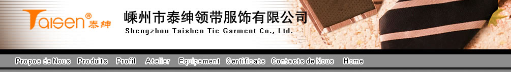 | Occupant une surface de 10,000 m2 , Shengzhou City taigeng cravate Co., une société authentifiée par ISO9001-2000, se trouve sur No.6, 4ème Rue, la Zone Industrielle de Cravate, Cité de Shenzhou, à la Province du Zhejiang, Chine. Les produits principaux de notre société sont : les habits et les parures tels que cravate, foulard de soie, noeud de cravate, parure de col, cachenez, rabat etc. Les cravates de la marque 《TAISHEN》produisées par notre société ont une réputation sur les marchés domicile et internationale : sur le marché domicile en Chine, les chiffres de vente de notre produits se classent dans les premiers rangs dans plus de 80 Magasins Réunis grands et médiocres, et notre produits sont très bien acceuillis par les consommateurs; sur le marché internationale, notre société a des relations commerciales avec Japon, Etats-Unis, Grande Bretagne, Australie, Canada, Corée de Sud, UAE etc. Depuis l’établissement de notre société, les indices de notre produits ont accédé les normes fixées dans plus de 10 tests organisés par《Centre de Test et Surveillance de Textile et Habit du Département Commerce Intérieur de Chine》, donc les qualifications de notre produits sont stables. Dans l’enquête lancée par le Centre d’Informations des Industries en Chine du Bureau Nationale de Statistique, les chiffres de vente de nos produits a occupé la 2ème place sur le marché domicile de produits du même genre, nos produits se sont classés dans《les 10 marques les plus bien vendues》. 《Qualification d’abord, Crédit fond 》 est l’objet contitu de notre société, nous tous fourniront plus de produits qualifiés avec plus d’enthousiasmes aux clients. |